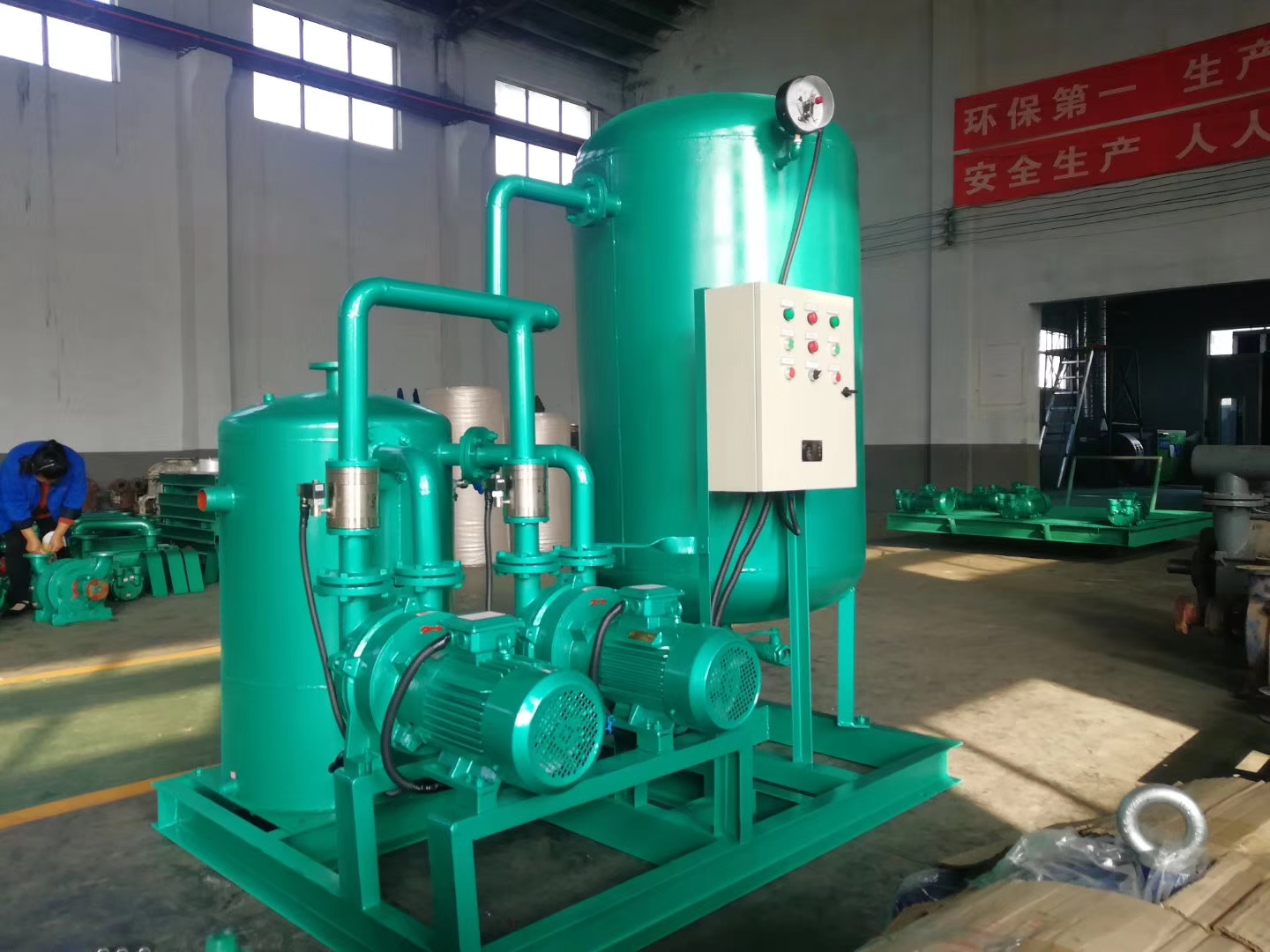 3、汽水串聯機組應先啟動水泵,水噴射真空開始工作,然后打開蒸汽開關,蒸汽泵開始工作。羅茨——水噴射機組應先啟動水泵,水噴射真空開始工作,真空度到——0.092Mpa時,才能啟動羅茨真空泵,低于真空0.092Mpa,應癢癢即停止羅茨真空泵工作,建議安裝設備控制電器開關,便于操作。